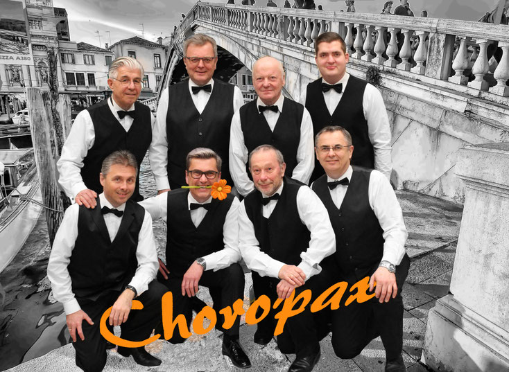 Choropax, die (Old)-Boy Group aus der Umgebung von Gunskirchen, gibt es schon fast ein Vierteljahrhundert lang: 1995 wollten 6 Männer des Sängerbundes Roitham ein paar schwungvolle "Comedian Harmonists"-Lieder singen und gründeten die Gruppe "Sechskant". Im Jahr darauf wurde auf acht Sänger aufgestockt und bei der internen Abstimmung, wie denn die Gruppe heißen sollte, setzte sich der Name "Choropax" durch.